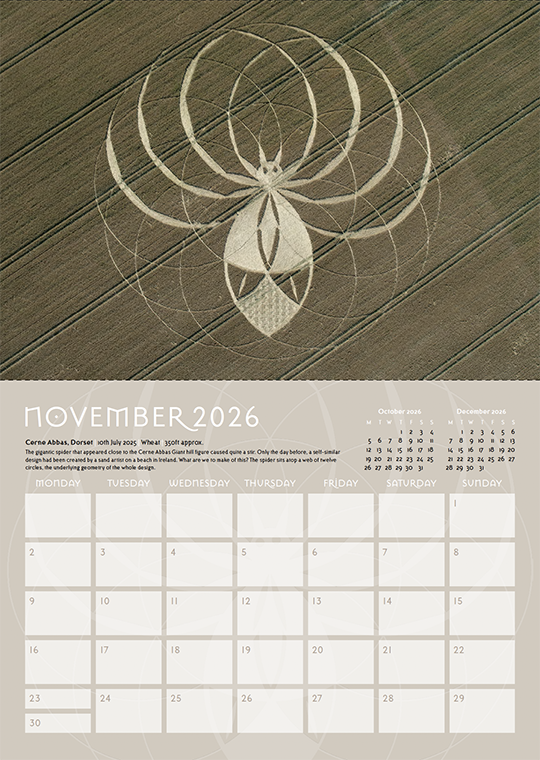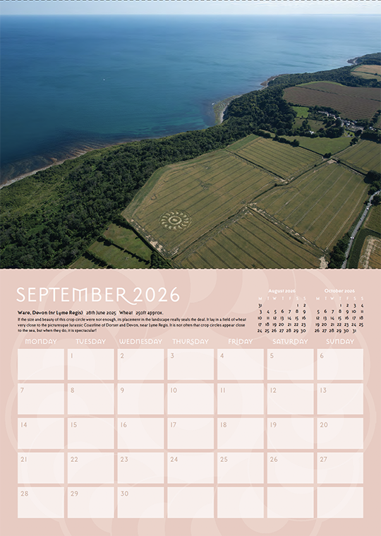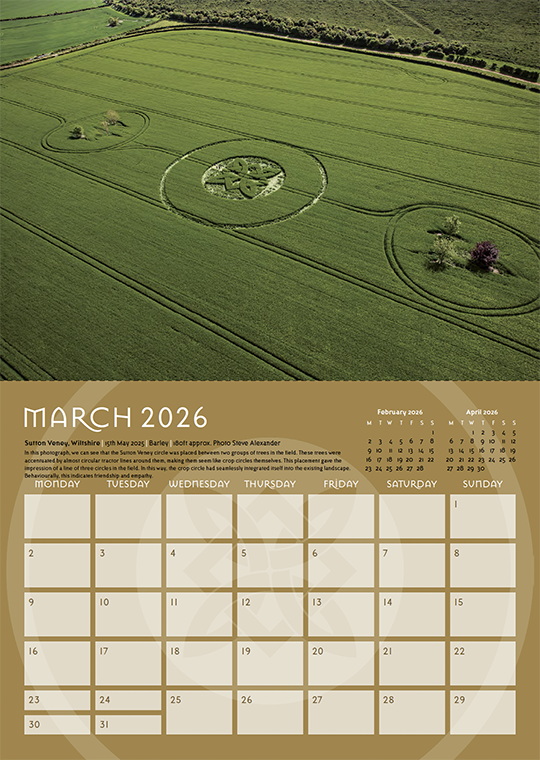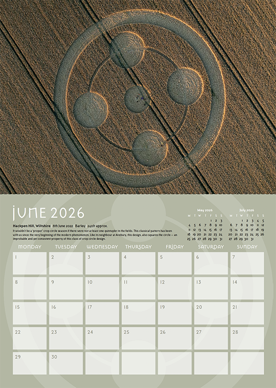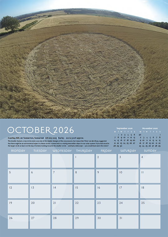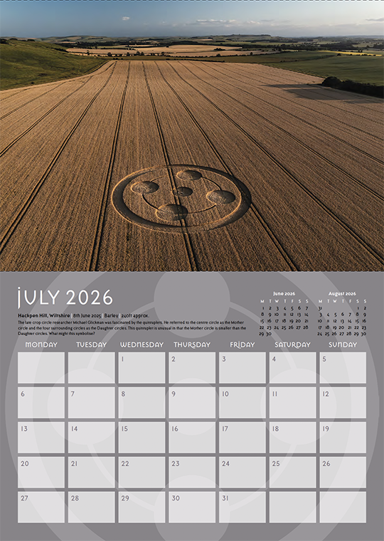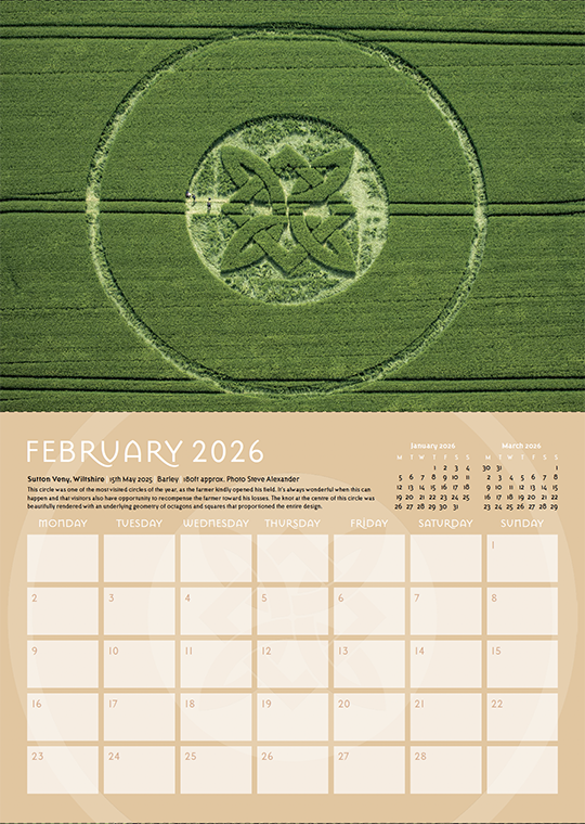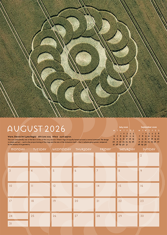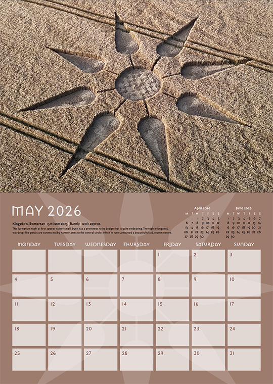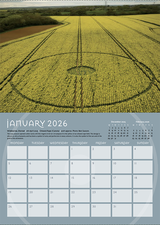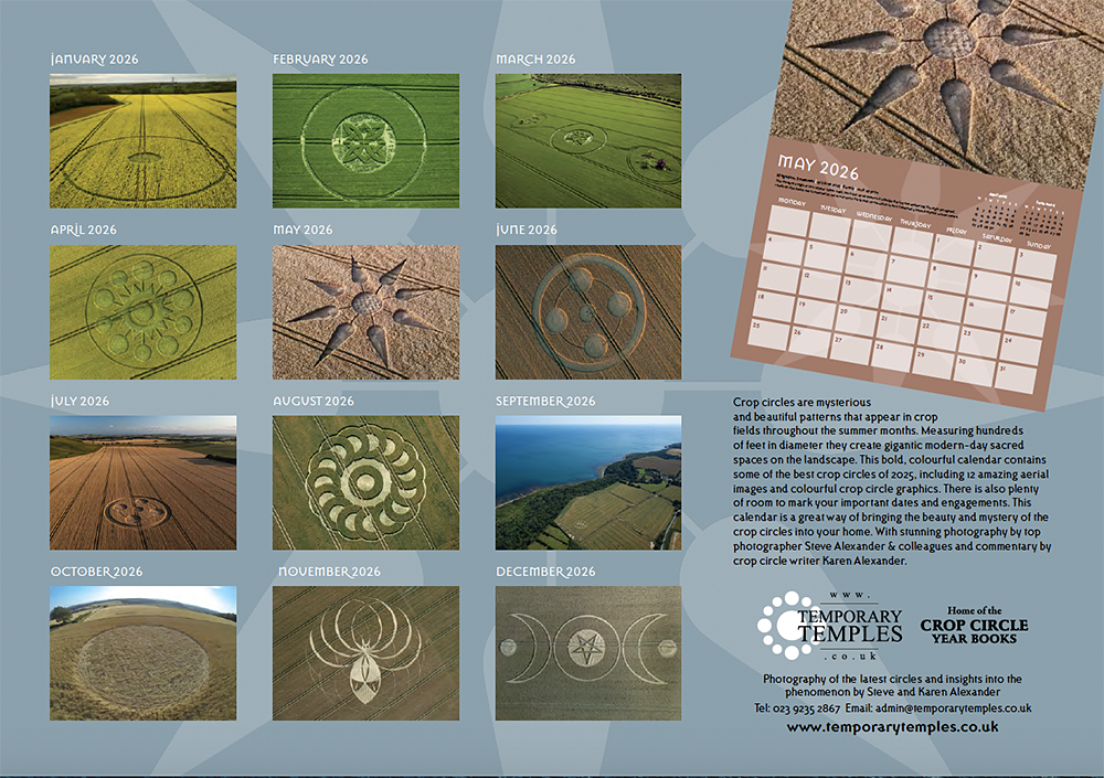 Welcome to our annual crop circle calendar. Each year we choose a selection of some of the best images from the season (2025) to include in this printed celebration of the phenomenon. If you are new to the crop circles let this calendar be your gateway into this wonderful phenomenon.